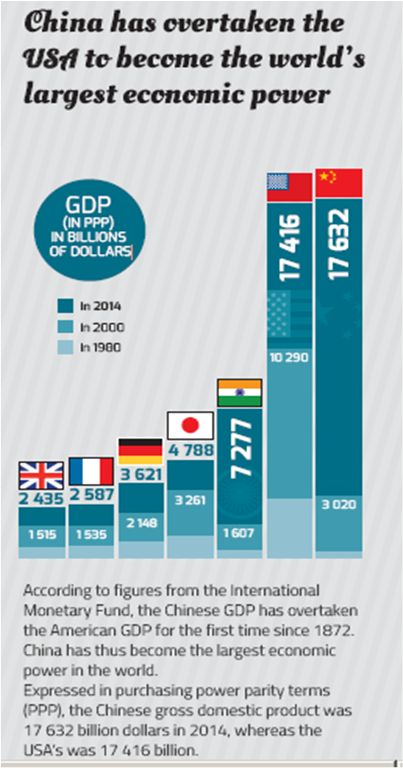 Tive uma professora de história que dizia que “se o mundo fosse perfeito a China seria o país mais rico do mundo” pelo simples facto de ter mais pessoas, ora bem, segundo o FMI a República Popular da China ultrapassou os Etados Unidos como a maior economia do mundo na perpectiva PPP, ou seja, usando uma taxa de câmbio que procura igualar o poder de compra entre os países.