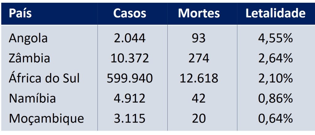 A pandemia de COVID continua entre nós, a nível global e local o número de infectados cresce e crescem também as preocupações com a possibilidade da deterioração total da saúde pública em Angola se o número de casos positivos graves crescer exponencialmente. Olhando para a nossa região, apesar do número de infecções confirmadas ser relativamente baixo (eventualmente com significativa subnotificação por incapacidade de testagem) a taxa de letalidade em Angola é relativamente elevada, por exemplo, a 21 de Agosto a Zâmbia tinha 10.372 casos confirmados e 274 óbitos que resulta numa taxa de letalidade de 2,64%, a África do Sul tinha 599.940 infecções confirmadas e 12.618 mortes, taxa de letalidade de 2,10%, Moçambique com 3.115 infecções e 20 óbitos tem  uma taxa de letalidade de 0,64%, a Namíbia com 4.912 infecções confirmadas e 42 óbitos tem uma taxa de letalidade de 0,86%, a mesma data, segundo dados da OMS, Angola tinha 2.044 infecções confirmadas e 93 óbitos, uma taxa de letalidade de 4,55%.