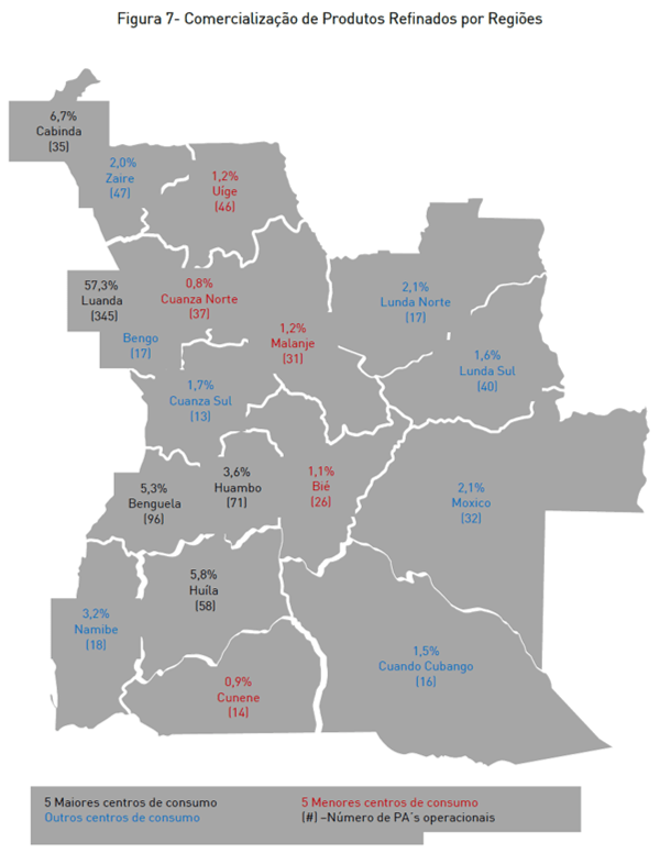 Contudo, folheando o relatório, dei por mim fascinado pelo mapa que indica o número de postos de abastecimento da Sonangol Distribuidora espalhados pelo país e fui transportado para um artigo que escrevi em Fevereiro de 2015 titulado “A geografia do comércio externo angolano e a ‘luandização’ do consumo” em que procurei expor o peso desproporcional de Luanda no consumo da economia angolana.