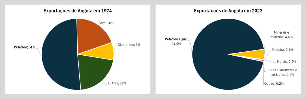 Como foi partilhado no artigo anterior, focado em como era a economia angolana nas décadas de 1960 e 1970, as exportações de petróleo estavam a ganhar representatividade de forma acelerada anos antes da independência, mas o que exportávamos era um cabaz bem mais diversificado do que é hoje. Nos nossos dias, apesar de várias manifestações de intenções temos uma “pizza” dominada por um único ingrediente com os mais de 90% do petróleo que compara com 51% em 1974, ano em que terminou a guerra pela independência e antecedeu a saída do governo colonial em Novembro de 1975.