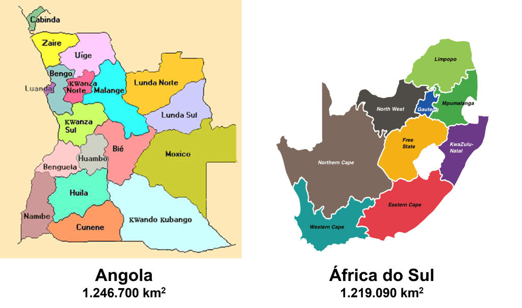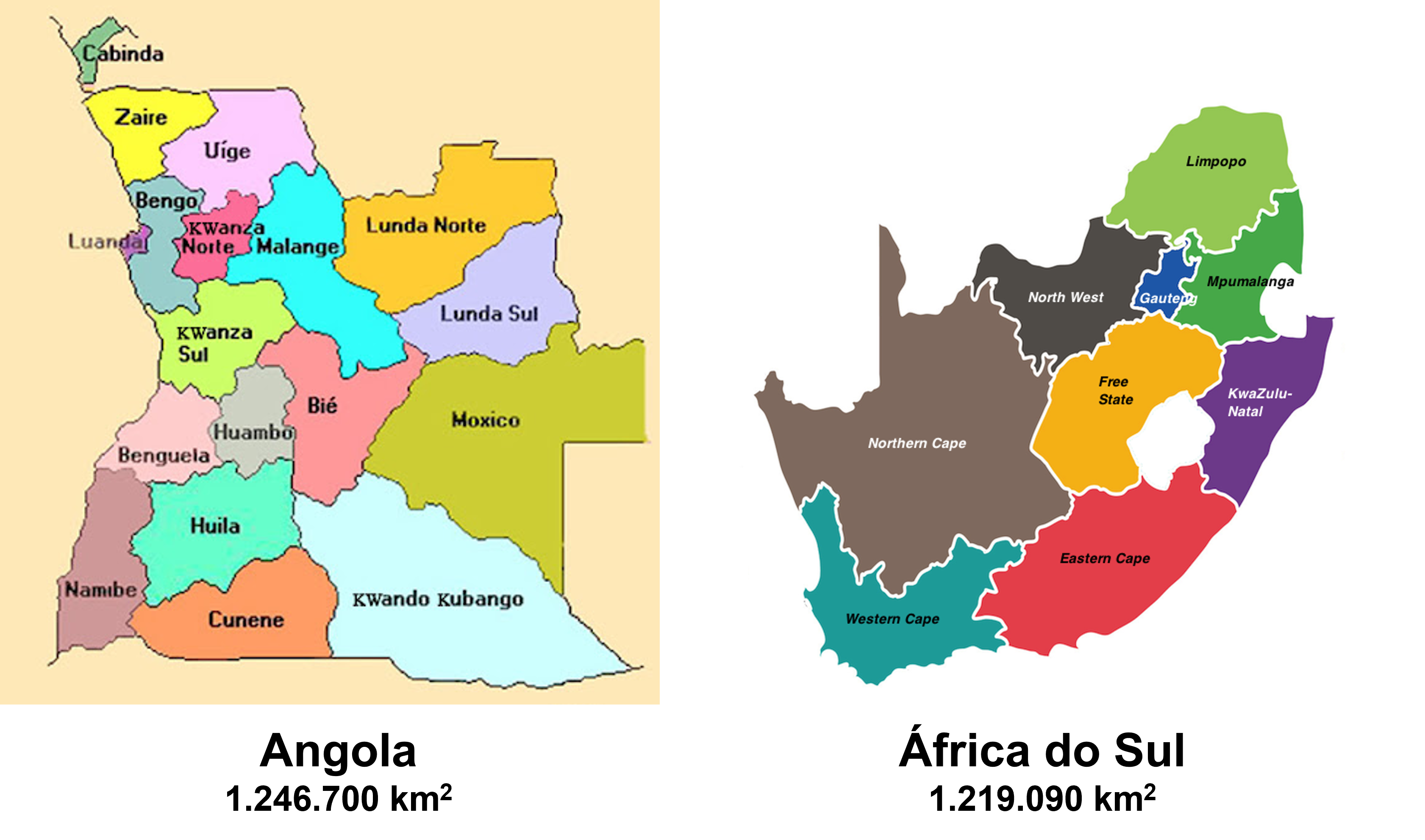 O nosso governo dá a entender que para um país com mais de 1,2 milhões de km2 18 províncias é pouco porque algumas delas são comparáveis à área total de Portugal. Contudo, nada foi dito sobre a África do Sul que tem praticamente a mesma área que Angola (1.219.090 km2) e tem o território dividido em apenas 9 províncias, num país federalizado com três capitais e com mais 15 milhões de habitantes que Angola.